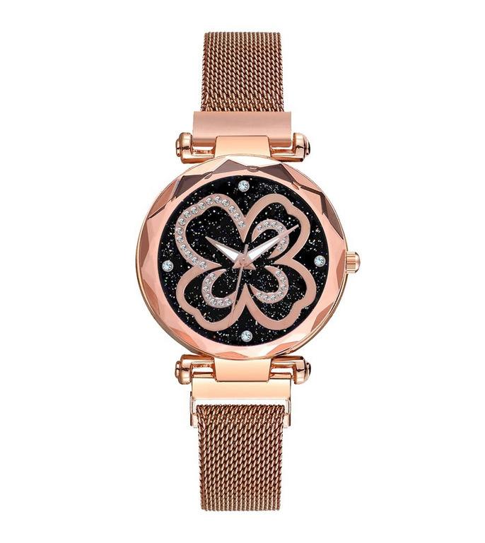 Reloj de moda, color como el de la foto, Reloj Diamantes Gold Rose Extensible Metal Mesh Imán Trébol 4 Hojas.