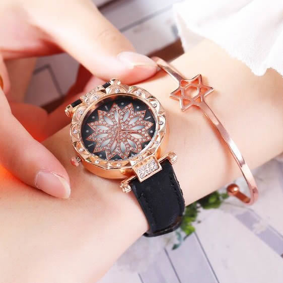 Reloj de moda, color como el de la foto, Reloj Gamusa Negro Extensible Piel Sintética Flor de Loto.