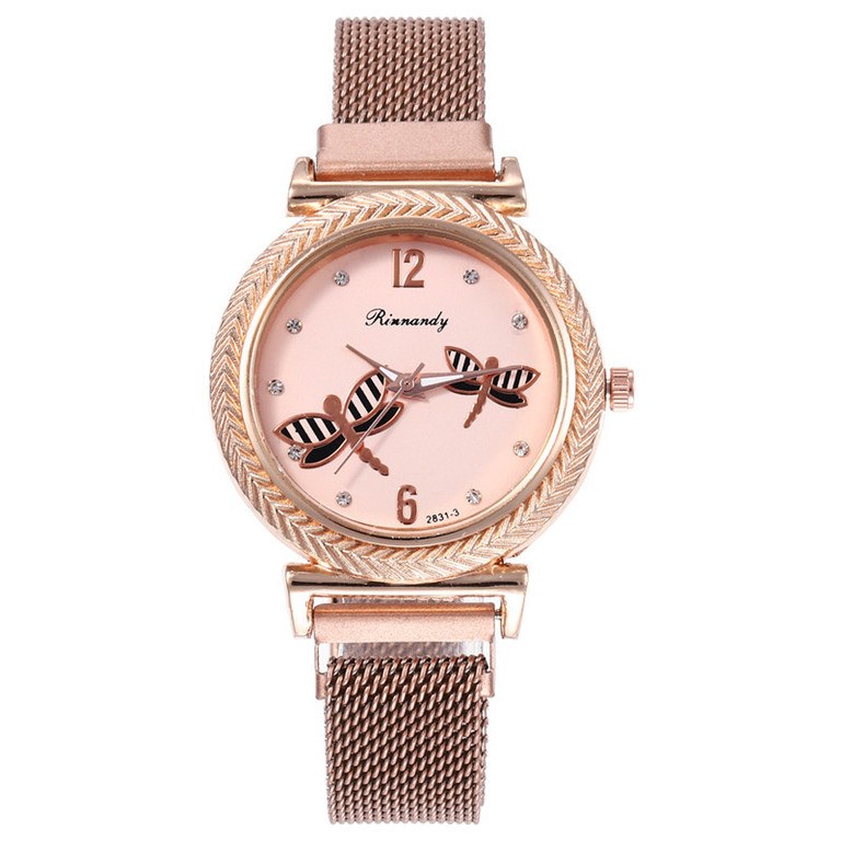Reloj de moda, color como el de la foto, Reloj Libélula y Diamantes Gold Rose Extensible Metal Mesh Imán Rosa.